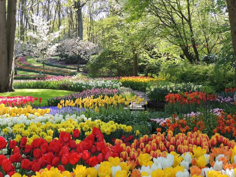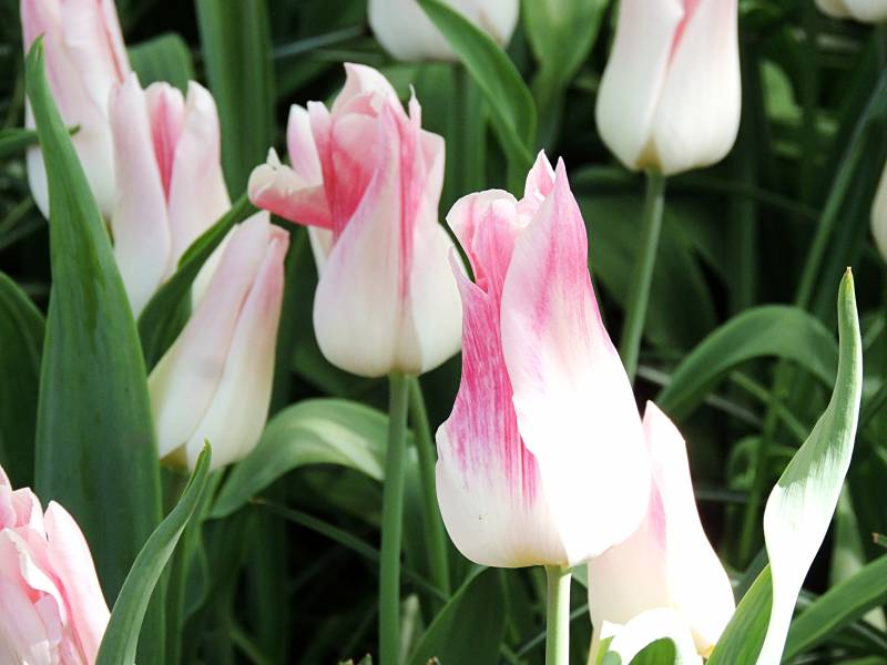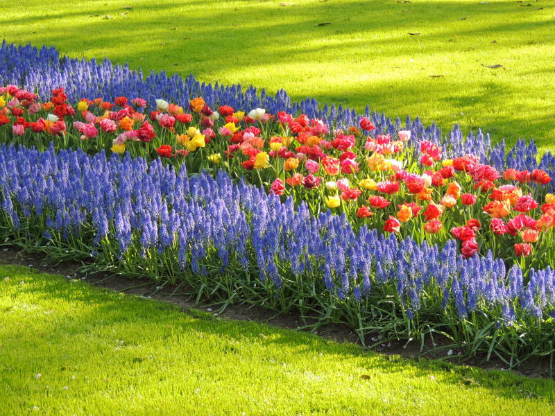 Tussen deze blauwe druifjes staan de pioenachtige tulpen.