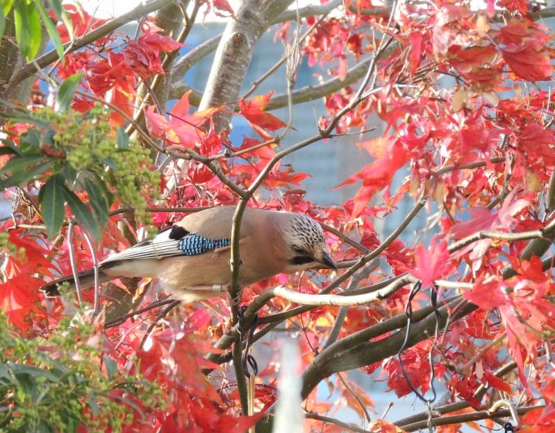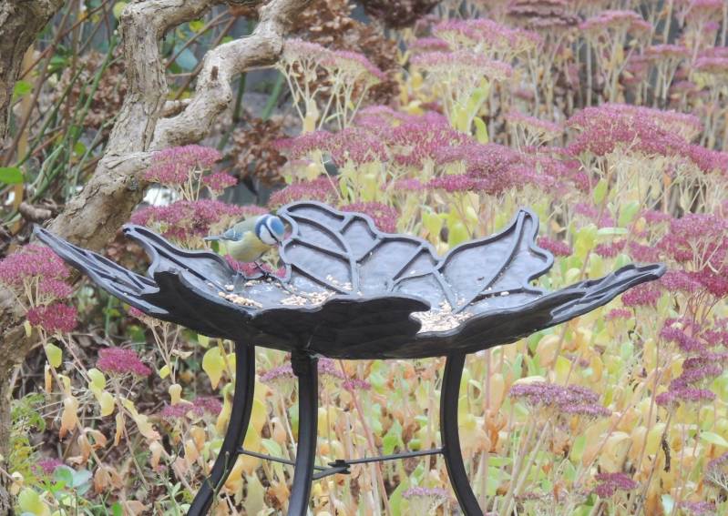 week 41 - Gaai bij mijn vogelbadje (prachtvogel) Op de achtergrond de Sedum Herbstfreude.