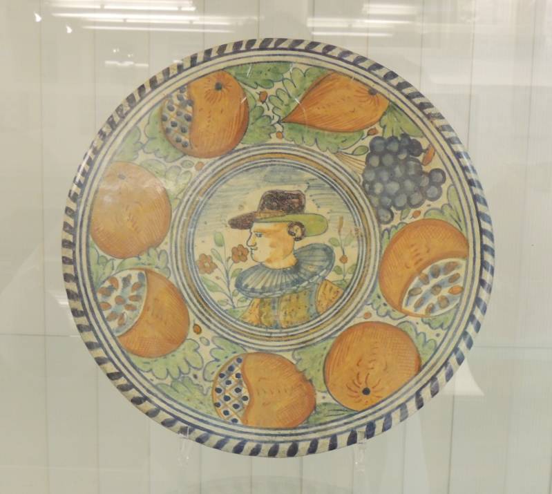 Polychrome schotel met portret van een man met molenkraag binnen een rand van granaatappels en druiven.